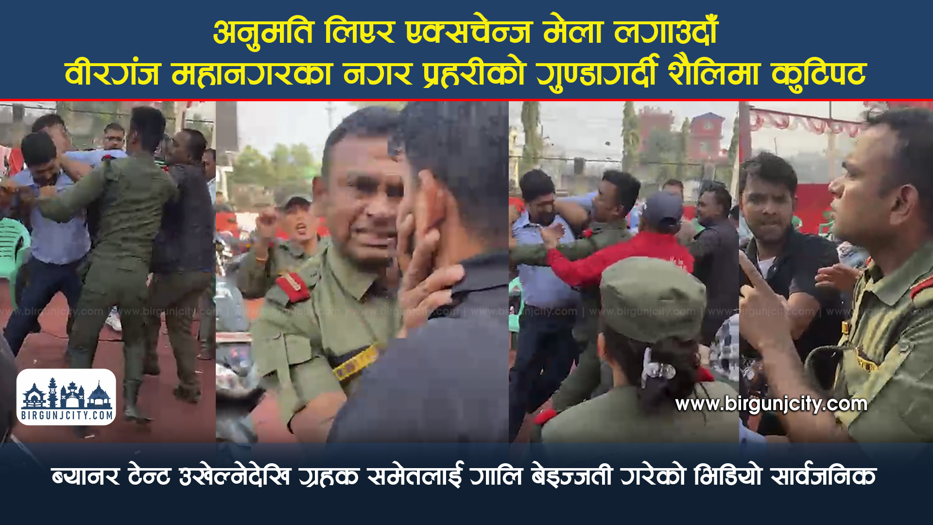 भारतीय दूतावास अगाडि रहेको लालबंगलाको खाली जग्गामा रोहित ईन्टरप्राइजेजले आयोजना गरेको हिरो एक्सचेन्ज मेलामा वीरगंज महानगरपालिकाका नगर प्रहरीले गुण्डागर्दी शैलीमा कर्मचारीमाथि कुटपिट गरेको भिडियाे सार्वजनिक भएकाे हाे ।