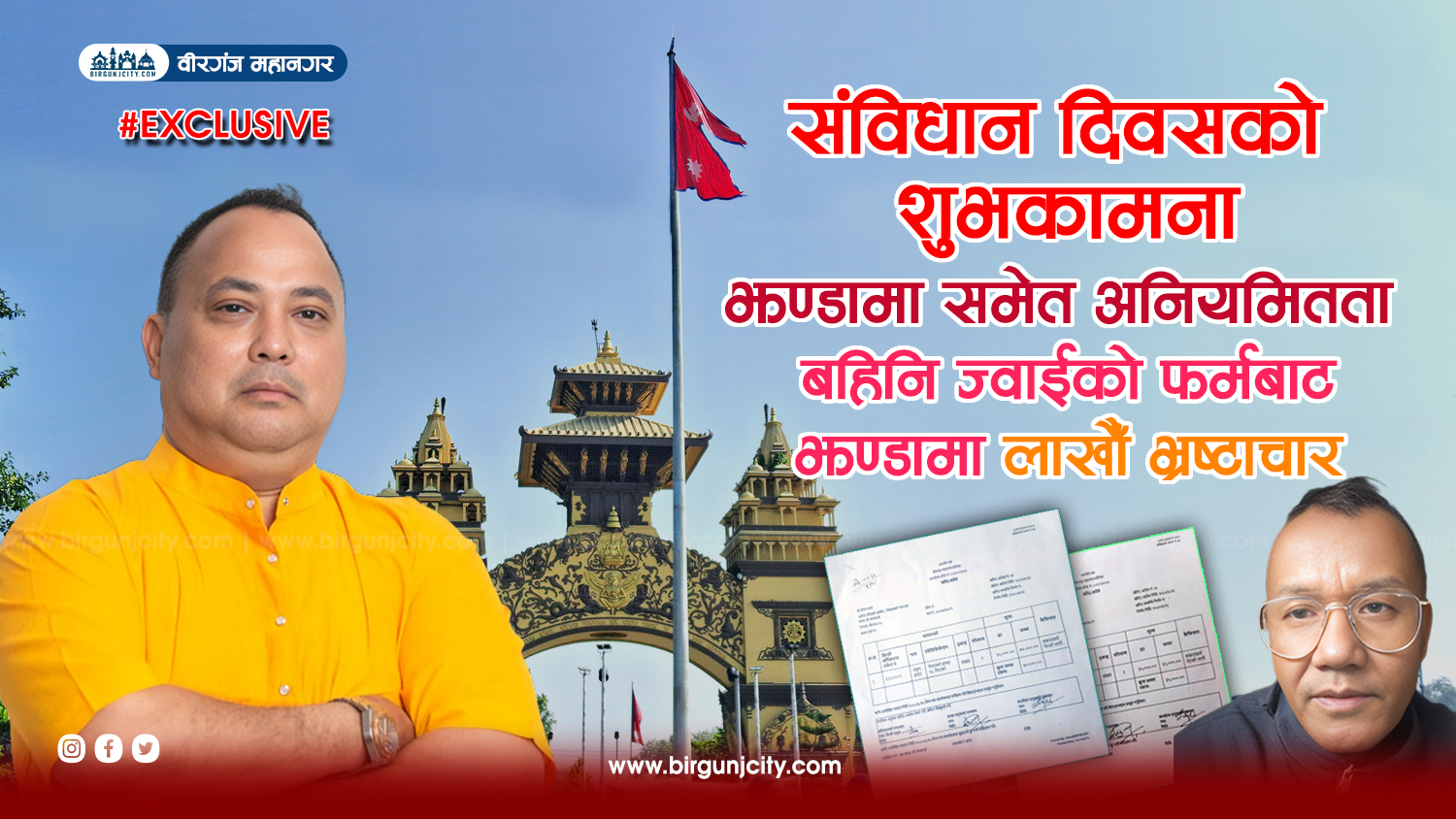 देशमा संविधान दिवस मनाइँरहदा झन्डामा भएको अनियमितताको कसले छानविन गर्ने गौन विषय हो । विश्व मै अनुपम रहेको देशको झन्डाको स्वरूपले नेपालको पहाड, हिमाल र तराई क्षेत्रको प्रतिनिधित्व गर्छ । झन्डाको माथिल्लो त्रिकोणमा सेतो चन्द्र र तल्लो त्रिकोणमा सेतो सूर्य अङ्कित छन्, जसले नेपालको स्थायित्व, दीर्घायु र शान्तिलाई सकेत गर्छन् । रातो रङले वीरता र साहसलाई दर्शाउँछ भने नीलो रेखाले शान्ति र समृद्धिको प्रतीकको रूपमा रहेको छ । महानगरलाई समृद्धिमा लाने कसम खाएका मेयर सिंहले आफ्नो परिवारको समृद्धिका लागी भरपुर प्रयास गर्दै आएका छन् ।