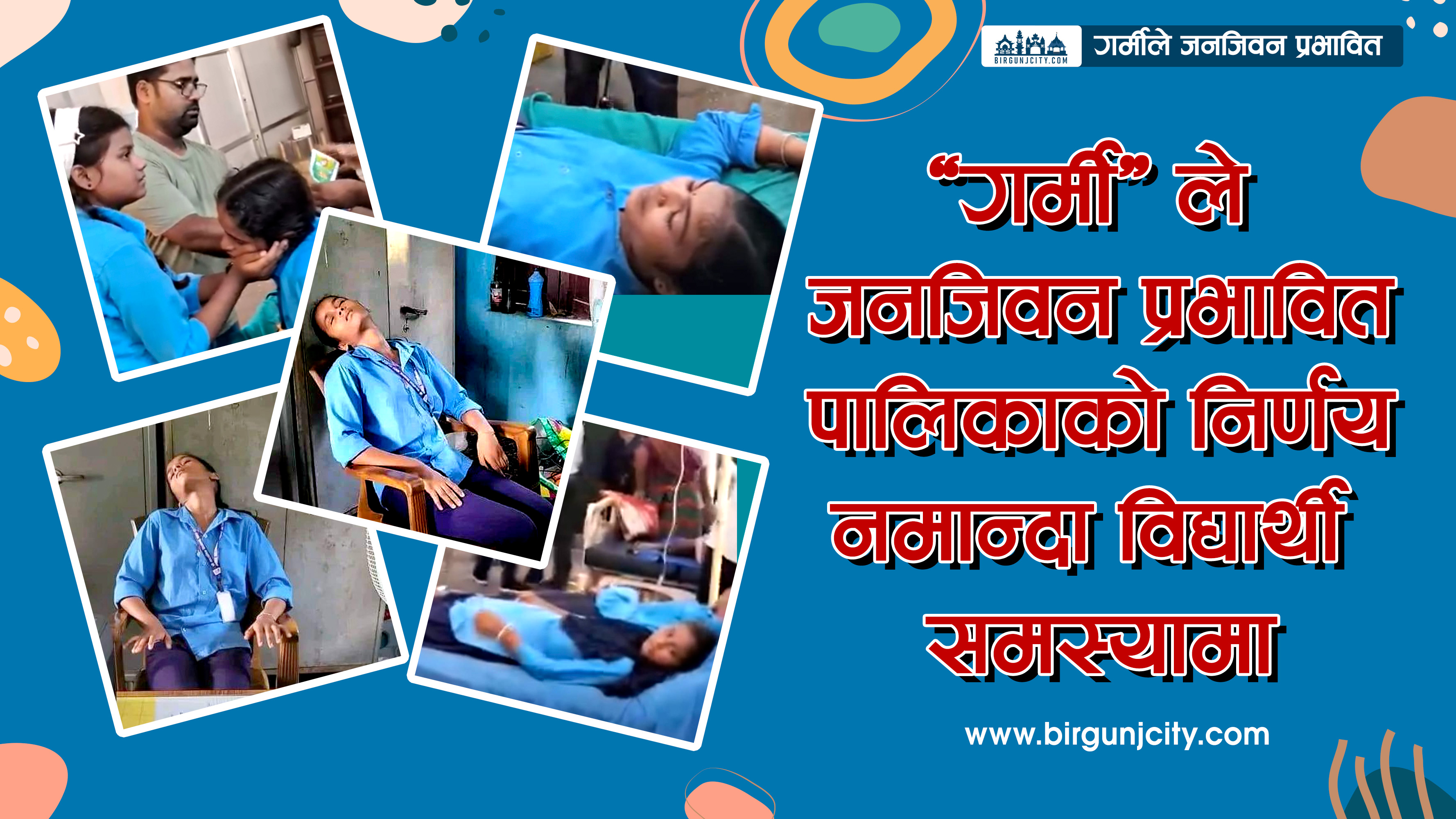 यसैबीच, वीरगंज महानगरपालिकाले अत्यधिक गर्मीका कारण असोज ८ र ९ गते दुई दिन विद्यालयहरू बन्द गर्ने निर्णय गरेको छ । महानगरका निमित्त प्रमुख प्रशासकीय अधिकृत अरविन्दलाल कर्णले जारी गरेको सूचनामा सामुदायिक तथा निजी विद्यालयहरू दुई दिनका लागि बन्द गर्न भनिएको छ । उनले विद्यार्थीहरूलाई घरमा अध्ययनको वातावरण मिलाउन र गृहकार्य गराउन आग्रह गरेका छन् ।